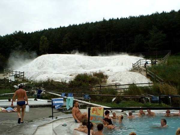 A parkolóban hagytuk az autót. Elindultunk gyalog a sportszatyorral, benne törölközőkkel, fürdőruhákkal, strandpapuccsal. A murvával felszórt erdei utat kétoldalt gyönyörű fenyőerdő vette körül, melynek illatát az őszi szél hozta felénk. A fenyők vékony csúcsai a széltől bólogatva üdvözöltek bennünket. A kabátunkon nyakig húztuk a cipzárt, és elindultunk az úton. Talán kétszáz méterre tőlünk, már láttuk a gőzt, ami a kicsi völgyben lebegett a levegőben. Az enyhén kénes illatot is érezni lehetett.